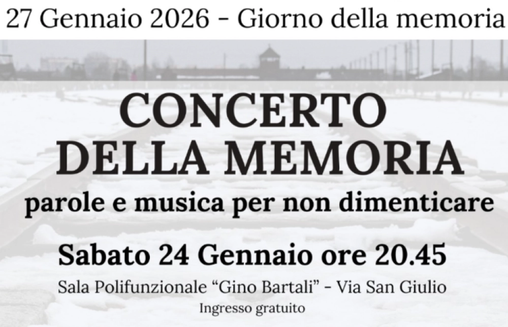 In occasione del Giorno della Memoria, sabato 24 gennaio 2026 alle ore 20.45, presso la Sala Polifunzionale "Gino Bartali" a Cavenago di Brianza si terrà il Concerto della Memoria, parole e musica per non dimenticare.