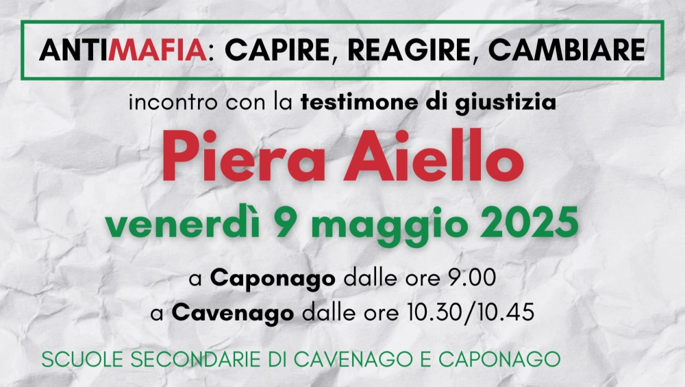 Nell'ambito dei progetti legati alla legalità, con il supporto di Rete Antimafie Martesana e Movimento delle Agende Rosse, venerdì 9 maggio 2025 gli studenti delle classi terze delle scuole secondarie di Cavenago e Caponago hanno incontrato la testimone di giustizia PIERA AIELLO.
