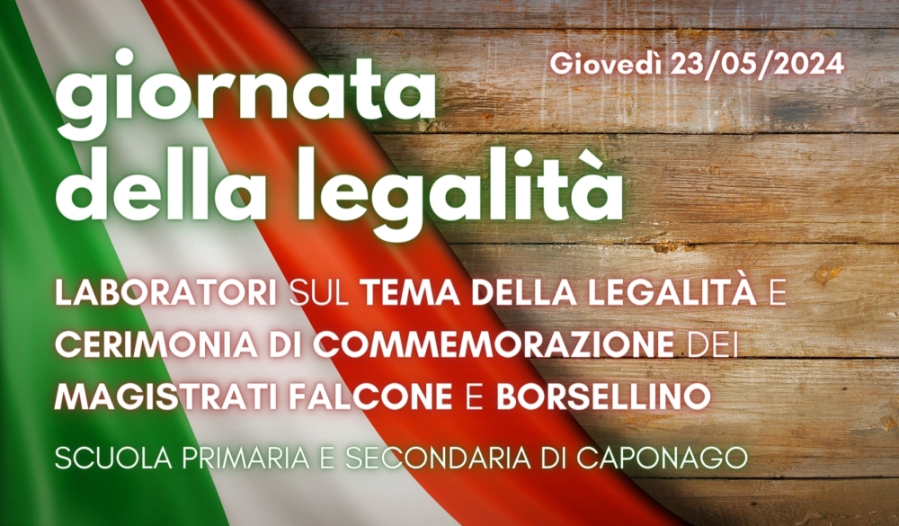 Giovedì 23 maggio 2024 dalle 9.00 alle 13.30 presso la Scuola di Caponago si svolgerà la Giornata della Legalità: un evento per la valorizzazione della cultura della legalità. Il programma è il seguente: