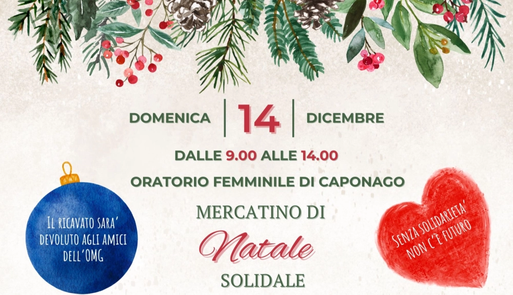 Domenica 14 dicembre 2025, dalle 9.00 alle 14.00, all'oratorio femminile di Caponago, bambini e bambine della Scuola Primaria, ragazzi e ragazze della Scuola Secondaria, Comitato Genitori, Volontari, scuola popolare Don Milani, Banca del tempo, Parrocchia, Pro Loco e Operazione Mato Grosso organizzano il mercatino di Natale solidale.